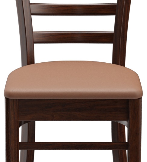Een typisch trattoria-zitmeubel is het model Ute met zijn naar beneden taps toelopende spijlenrugleuning – verkrijgbaar als stoel en als barkruk. Ute is gemaakt van heveahout in de kleur noten. De gestoffeerde zitting van het kunstleder Casual is beschikbaar in drie kleuren. Voor de barkruk is een voetsteunbeschermer verkrijgbaar.- Massiefhouten stoel