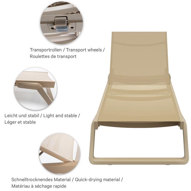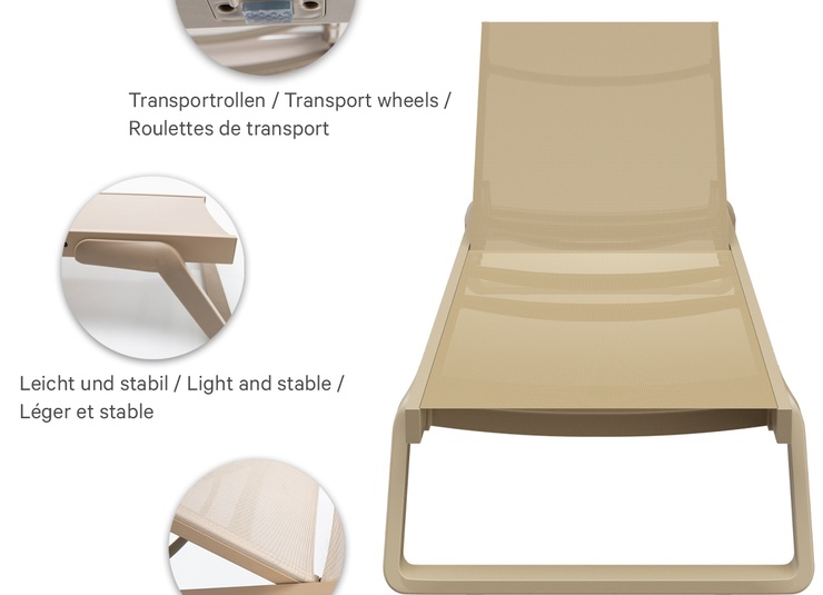De SELINA ligstoel combineert stijlvolle lichtheid met professionele robuustheid en is daarmee ideaal voor gebruik in de horeca, hotellerie, thermen en spa-omgevingen. De voetbeugel van glasvezelversterkt polypropyleen en het gepoedercoate aluminium frame zorgen voor stabiliteit, duurzaamheid en een aangenaam lichte handling in het dagelijks gebruik. Het slijtvaste polyester meshweefsel is onderhoudsvriendelijk, comfortabel en droogt bijzonder snel. Dankzij de transportwielen kan SELINA flexibel worden verplaatst en snel opnieuw worden geplaatst. De stapelbare uitvoering bespaart bovendien ruimte en vergemakkelijkt opslag en reiniging. Zo overtuigt SELINA niet alleen door comfort en een moderne uitstraling, maar ook door een aantrekkelijke prijs-kwaliteitverhouding voor professioneel gebruik.- Bespaart moeite: Licht, stapelbaar en snel te verplaatsen