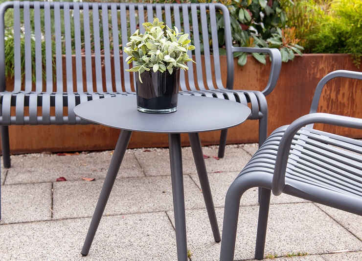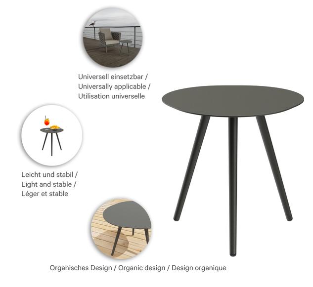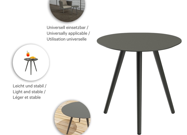 De salontafel Afra is de perfecte aanvulling voor elke horecagelegenheid. Zijn driepotige constructie zorgt voor een stabiele stand, terwijl zijn universele ontwerp diverse toepassingsmogelijkheden biedt. Het onderhoudsvriendelijke oppervlak en de hoogwaardige, zijdeglanzende poedercoating met fijne structuur geven de Afra niet alleen een aantrekkelijk uiterlijk, maar garanderen ook een langdurige kwaliteit. Of het nu binnen of buiten is, Afra is de ideale keuze voor veeleisende horeca-instArtikelnummer
